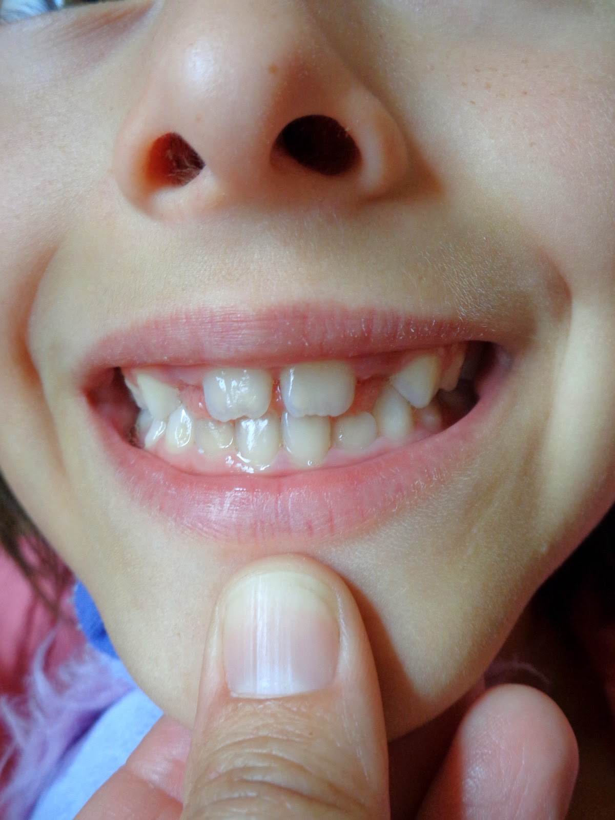 | Pre-treatment (April 2014) - Alina's baby teeth have no space between them (minus the one spot where she is missing a tooth) |